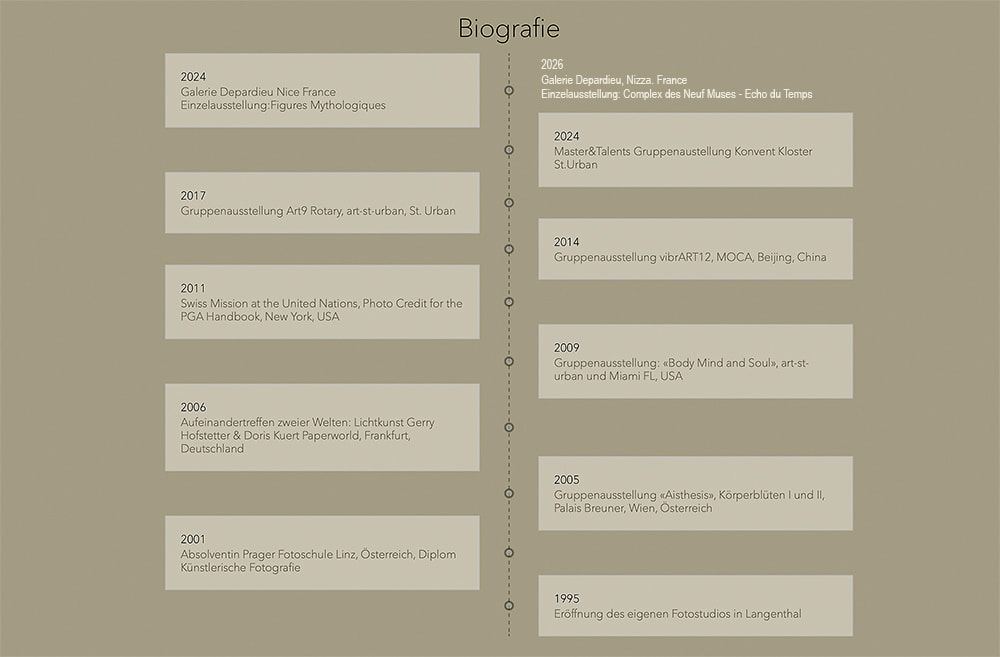 Als freischaffende Fotografin mit eigenem Studio, lebe und arbeite ich in der Schweiz und in Frankreich. Nach 40 Jahren Auftragsfotografie für Wirtschaft und Industrie arbeite ich heute als bildende Künstlerin mit Fotografie und Film, um meine Ideen umzusetzen und meine Geschichten zu erzählen. Leidenschaftlich interessieren mich das göttlich Weibliche, die innere Dunkelheit und das spielerische Selbst. Als Fotografin führe ich einen Diskurs an der Schnittstelle zwischen digitaler und analoger Fotografie, insbesondere mit Fotoemulsionen. Meine Werke wurden in grossen Formaten in internationalen Einzel- und Gruppenausstellungen im In-und Ausland gezeigt. «Als Künstlerin, die sich selbst porträtiert, wird sie zu den Figuren ihrer Träume und Fantasie. Ihr Schwerpunkt liegt auf dem göttlich Weiblichen, der inneren Dunkelheit und dem spielerischen Selbst».. Die Faszination, in verschiedene Charakterrollen zu schlüpfen, begleitet mich seit Beginn meiner Laufbahn. Mithilfe vielfältiger Materialien verberge oder zeige ich mein Gesicht, um die Dynamik zwischen Maske und Authentizität zu erforschen. Ein Zitat von Nietzsche: «Alles, was tief ist, liebt die Maske» (J 40). AUSBILDUNG